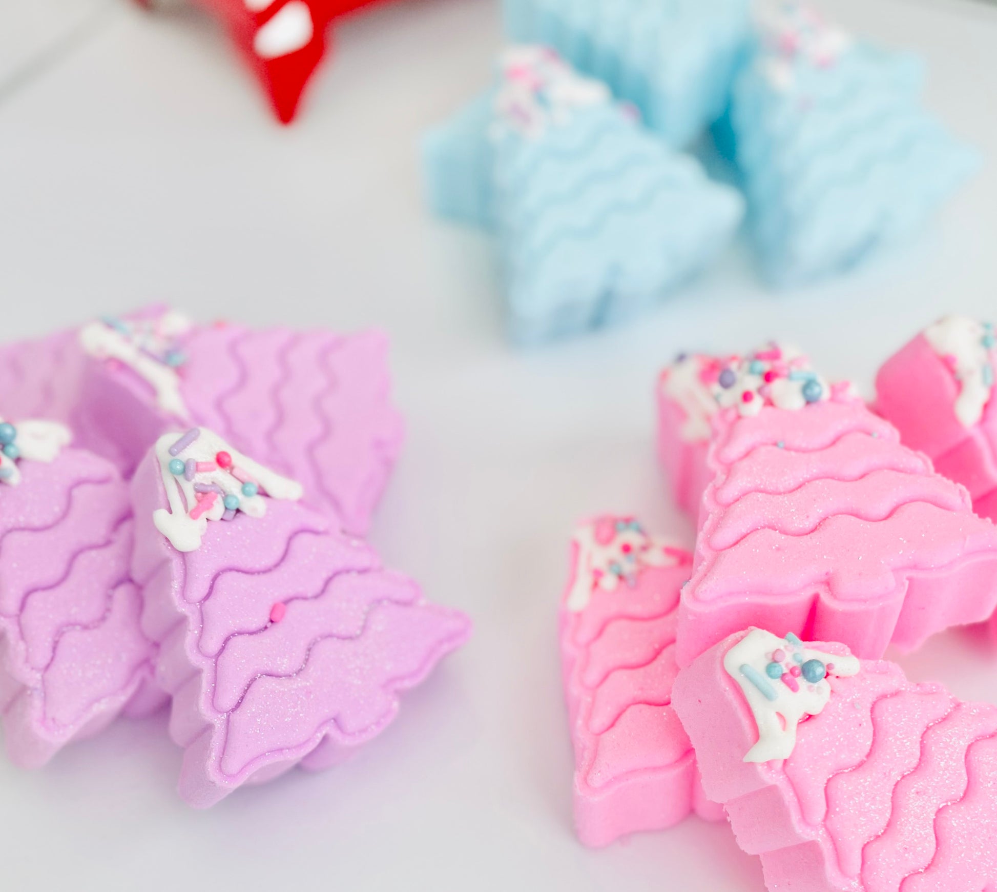 Pastel Pines Bath Bomb is sure to bring some holiday cheer. Perfect for gifting, topped with bath frosting snow peaks and sprinkles these pines are sure to capture your attention.Skin loving oils help to moisturize and sooth your skin while bathing. These pines come in pink, blue, and purple and are scented in a sweet aromatic holiday scent the evokes soft pines, peppermint and sweet vanilla.